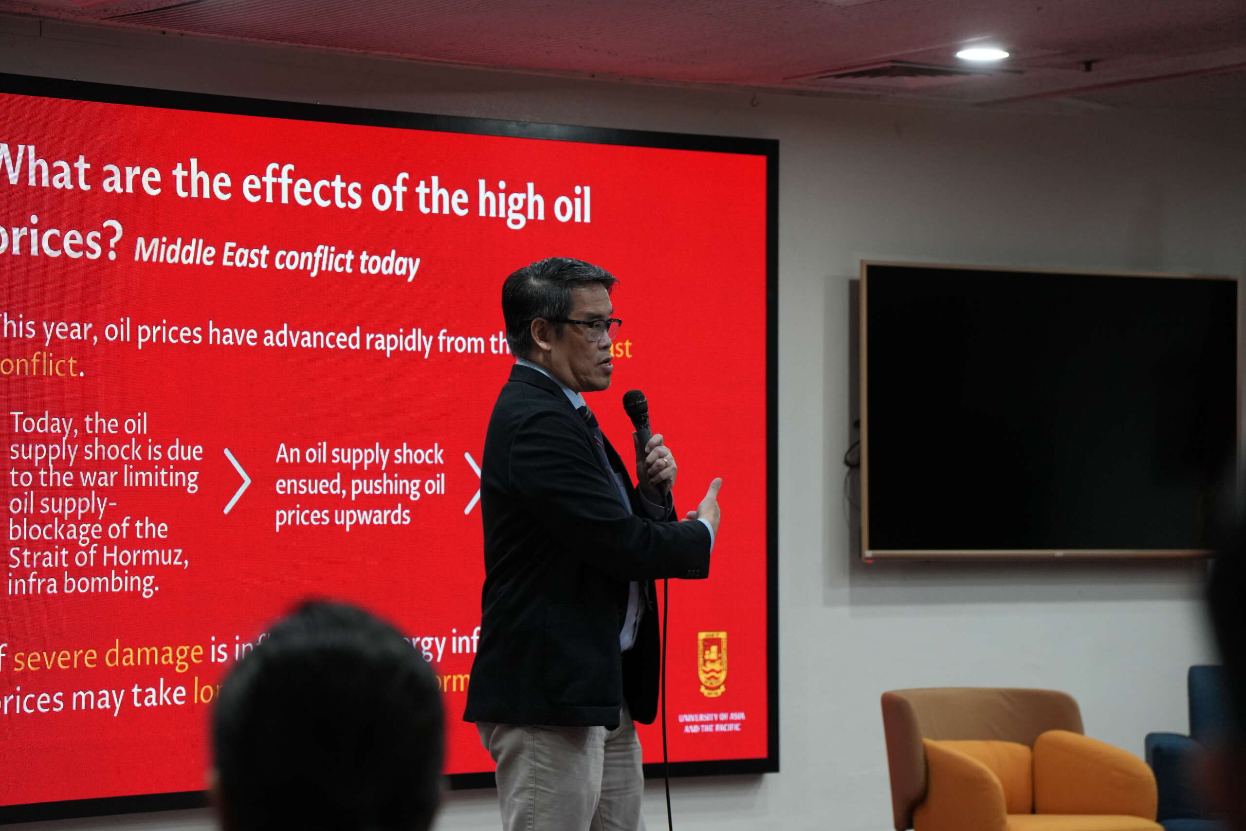 The pain does not stop at the pump. Dr. Lee U walked through how oil price shocks move through the economy—hitting transport first, then food, which carries the single largest weight in the Philippine consumer price index.